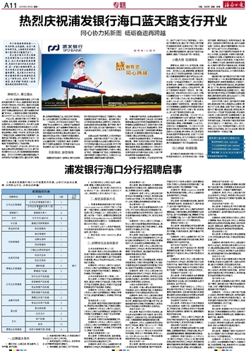 开业以来,浦发银行海口分行秉承“立足海南、依托海南、服务海南、支持海南”的发展宗旨,以与海南同成长、共分享为发展目标,围绕海南国际旅游岛建设中心任务,深耕海南金融这片沃土,勇立海南金融创新发展潮头,短短一年多来,各项业务实现了跨越式发展,金融服务能力显著提升,经营效益不断增强,成为海南银行业中一支重要的新生力量,为实现“科学发展、绿色崛起”的海南梦做出了积极贡献。