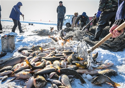 渔工在查干湖面收集捕捞上来的鱼。收网时,几匹高头大马拉动牵引着钢丝绳的绞盘,四五米宽的大网裹着冰层下的鱼儿从宽一米、长两米的出鱼口缓缓露出冰面。 查干湖位于吉林省前郭尔罗斯蒙古族自治县境内,蒙古语意为“白色圣洁的湖”。查干湖至今仍保留着传统的冬捕方式。每年12月中旬到次年3月,查干湖进入冰封期。参加冬捕的渔工驾马车踏上冰面,依经验选择若干合适的位置钻孔、下网,并透过冰层追踪鱼群动向,最后收网捕鱼。 新华社发