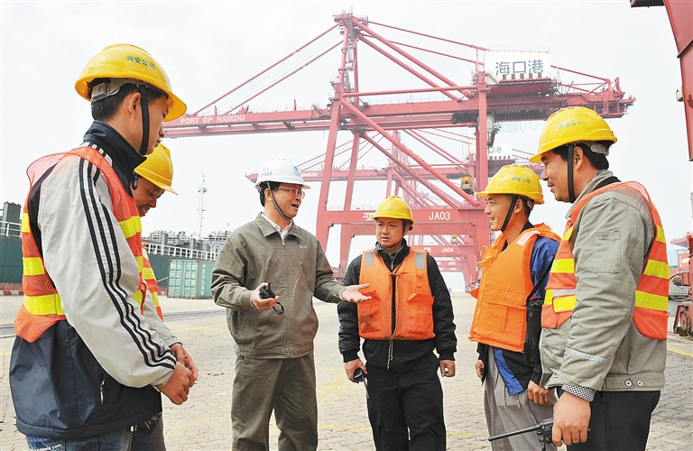 2月8日,海口港集装箱码头装卸区,省人大代表张陈慧(右四)在会议前深入生产一线,了解码头作业工人的心声。他表示一定会把工人们提出的有关工资待遇、劳保等方面的问题带到两会上。