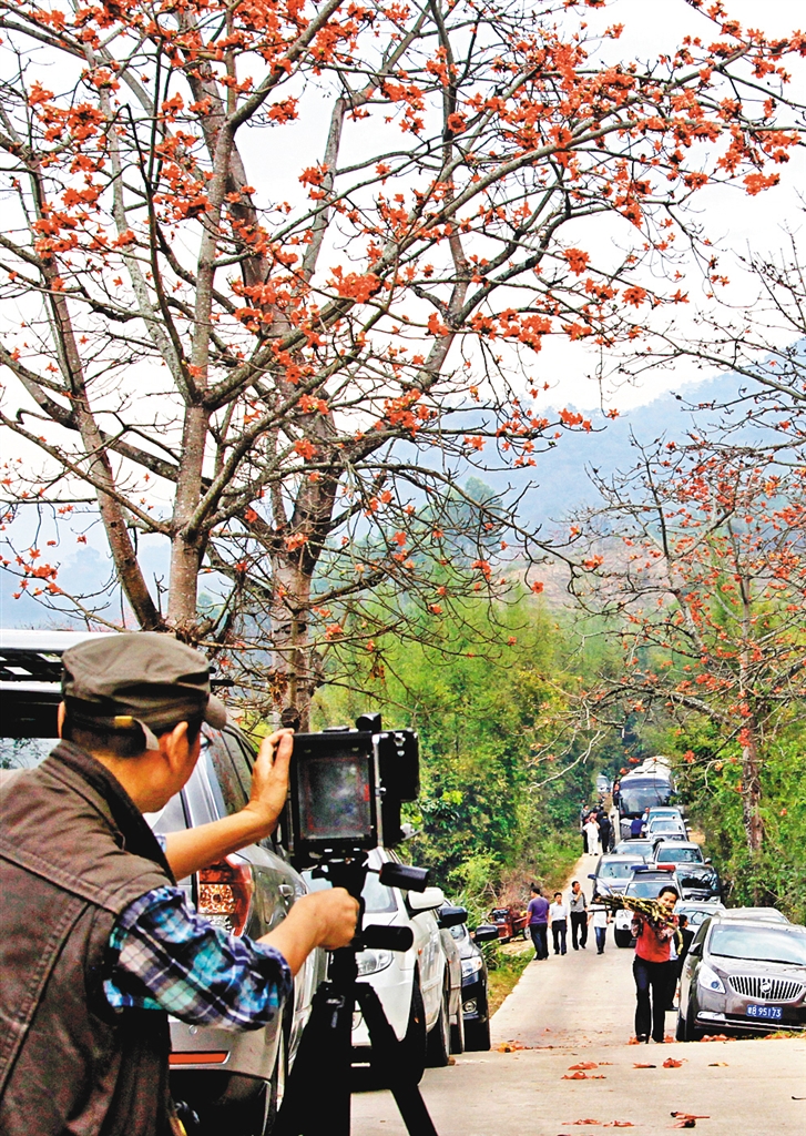 “几树半天红似染,居人云是木棉花。”诗人总是那样言简意赅。驱车行驶在昌江七叉镇的乡村道路上,远山如黛,近处的田间地头、路边江畔不时出现一棵棵粗壮的木棉树,树干挺拔,树枝四张。木棉花热烈绽放,漫山遍野火红娇艳,四方游人齐聚于此,皆因被美丽的木棉花深深吸引。