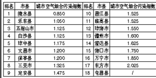 备注:1.屯昌县监测数据有效率不足,达不到评价要求;2.城市空气综合污染指数相同的市县,按照单项指标污染指数大小排名。