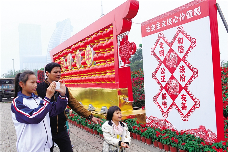 随着春节临近,海口国兴大道部分路段花团锦簇,张灯结彩,在节俭的同时营造着喜庆祥和的节日气氛。图为市民在拍照留念。