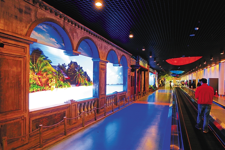 这便是美兰机场旅游文化长廊。这条位于美兰机场到达厅旅客通道单边墙壁的旅游文化长廊,全长126米,采用“仿真浮雕+实景彩绘+三维视频”动静融合的展现形式,将魅力独特的海南历史文化、民族民俗文化、热带岛屿海洋文化串成一幅画卷展现在游客面前。同时,该文化长廊与拐角位置的“海南省旅游咨询服务中心”整体风格保持一致,二者相辅相成,为游客提供一站式服务。