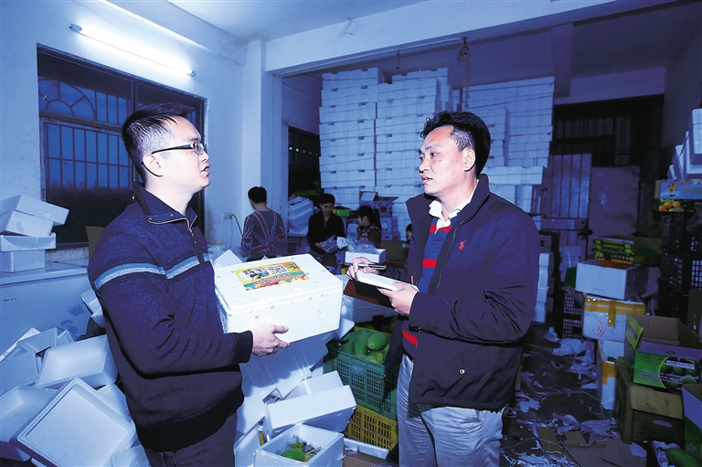 2月8日,王文克(右)在参加完当天下午的预备会后,前往海口市府城南北水果市场,向年轻创业者了解海南水果电商的运营情况。