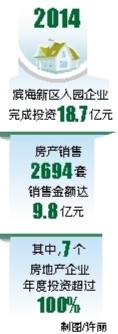 2014年,滨海新区入园企业完成投资18.7亿元,房产销售2694套,销售金额达9.8亿元。其中,7个房地产企业年度投资超过100%:诸如,博亚兹房地产项目当年实际投资1.8亿元、年度投资率高达300%;中视·金海湾项目实际投资1.64亿元、年度投资率为205.3%;恒大·金碧天下项目实际投资3.07亿元、年度投资率为139.5%;白马湾·滨海花园实际投资近2亿元、年度投资率为127%。