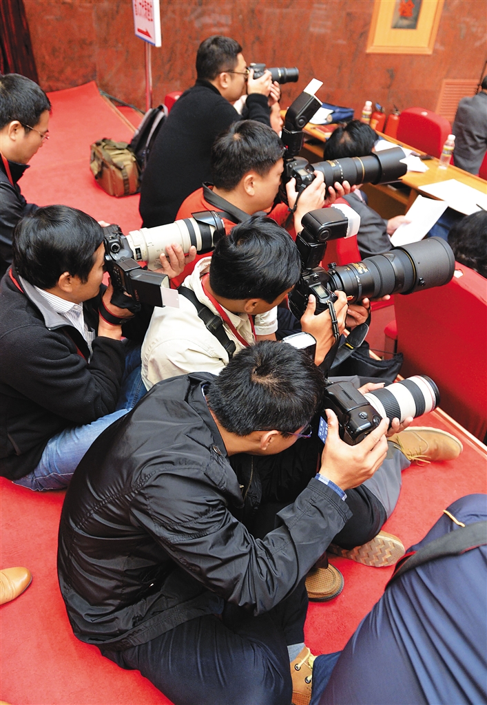 捕捉精彩 今年两会的各项议程、议题引起众多媒体的关注。摄影记者为了能捕捉到精彩的瞬间在地上一蹲就是半小时,图为2月11日,会场内的摄影记者。本报记者 王凯 摄