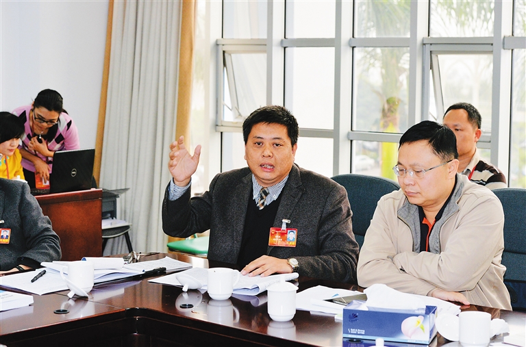 2月9日下午,省五届人大三次会议各代表团审议政府工作报告。图为儋州代表团黄桂提代表提出进一步加大海南与台湾的旅游交流与合作。 本报记者 王凯 摄
