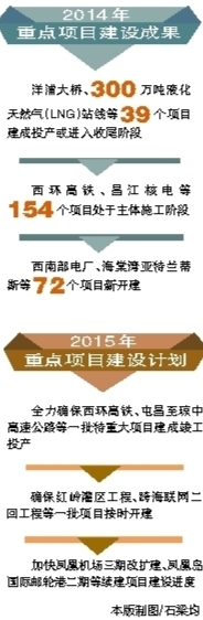 仅在2014年,洋浦大桥、300万吨液化天然气(LNG)站线等39个项目建成投产或进入收尾阶段。西环高铁、昌江核电等154个项目处于主体施工阶段。西南部电厂、海棠湾亚特兰蒂斯等72个项目新开建。