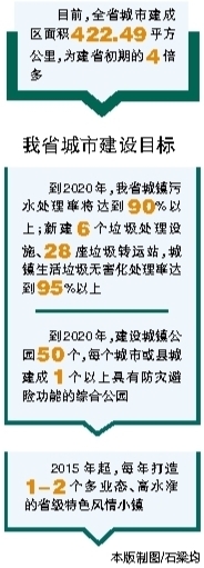 丁式江说,我省还将加大城市绿化投入,加强城镇道路绿化、公共绿地、小区绿化建设,推动形成密切联系城市与乡村的社区、路网、公园三级绿道体系,争取实现城镇“黄土不露天”;到2020年,建设城镇公园50个,每个城市或县城建成1个以上具有防灾避险功能的综合公园。
