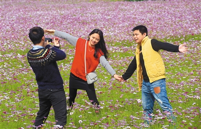2月14日,两名游客在花海中拍摄留念。当天,琼海市龙寿洋国家农业公园花海正式开园迎宾。数百亩万寿菊、百日草、格桑花等绽放,将田园点缀成姹紫嫣红的大花园,吸引众多游客前来观赏拍照。特约记者 蒙钟德 摄