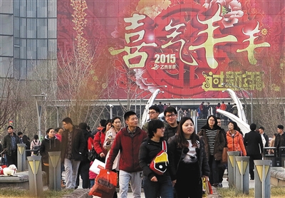 2月14日,市民走在泉城路上的大型商场前。 春节临近,山东济南街道上人流如潮,人们纷纷利用周末时间备置年货,呈现“喜气羊羊”的新年景象。 新华社记者 冯杰 摄