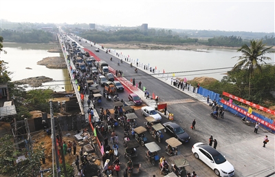 这座长397米、宽24.5米、投资6300万元、横跨南渡江的大桥以崭新的面貌亮相在人们眼前:双向四车道、专设的人行道、平整的柏油路、厚实的大理石围栏。“从听说要建新桥就盼,一直盼到今天,桥建好了,我们的生活更方便了。”激动的王江带着永发镇广场舞姐妹团,自发编排歌舞《张灯结彩》、《好一朵美丽的茉莉花》等,庆贺永发大桥正式通车。