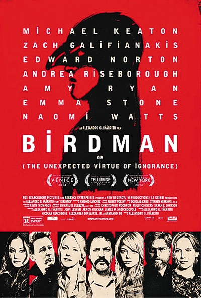 威尼斯电影节开幕影片《鸟人》,是墨西哥导演伊纳里多继《爱情是狗娘》、《21克》、《巴别塔》、《美错》之后,第五度入围奥斯卡提名。影片依旧带着拉美文学的超现实主义基因,现实发生的幻想与戏剧演绎的生活、过气潦倒的明星和如影随形的“鸟人”在影片中高度重合,生活与舞台、现实与戏剧,观众看到角色和生活的分裂,和分裂背后,浮华世事的徒有其表和富饶幻想的内在真实。《鸟人》是本届奥斯卡中笔者最为欣赏的作品,它的“戏中戏”设置让我想到《日落大道》和《锡尔斯玛利亚》,而对名人(好莱坞)的反讽部分又像是翻版的《公民凯恩》或《名人百态》;影片兼顾了电影的文学性和思辨性,通过移动摄影、布景更替实现了若干个长镜头的无缝连接,电影技法和影片主题均达到了导演前所未有的高度,在奥斯卡前哨战不温不火的情况下,接连拿下演员工会最佳群戏、制片人工会(PGA)最佳影片和导演工会最佳导演三项大奖后,大有后来者居上之势,剑指本届奥斯卡最佳影片。