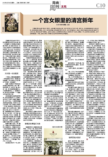 王锡璠(笔名金易)和沈义羚所著的那本《宫女谈往录》,是一本有趣的书,作家章诒和读后爱不释手,专门撰文评论说:“它为我们呈现的不过是封建宫廷生活的一角,仅此一角,就足以让我们震惊和思考。《谈往录》所具有的真实、透析和细微,我们现在的史学家、政论家未必能及。作者运用散文笔法,语言流畅自如。平静的叙事,如云如絮,有着冲淡幽深的气氛。”这本书分为宫女生活、慈禧起居、清宫习俗和宫闱琐记等几个部分,其中在慈禧起居一节里,老宫女回忆了慈禧太后过年时的种种礼仪和规矩,娓娓道来,让人难以忘怀。