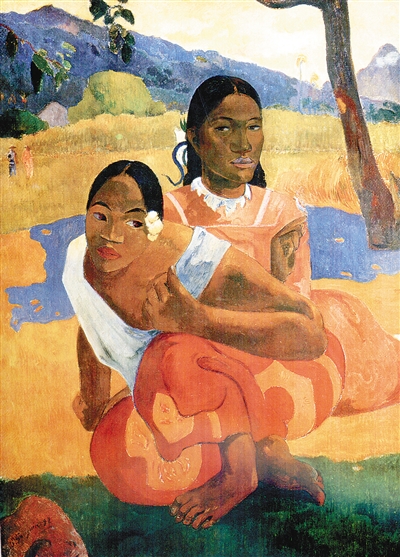 这幅画的题名用的是塔希提语译音“Nafea Faa Ipoipo”,意思是“你什么时候结婚呀”,画面中两名塔希提女子坐在阳光下的草地上,似乎正在倾述内心秘密,古铜色的皮肤和明艳的光照形成了强烈对比。令人称奇的是,高更将草地处理成大片的金红色,却一点儿也不令人觉得唐突,反而使整体的暖色调更加谐调。这幅画无论是构图还是用色都别具一格,洋溢着神秘浪漫的情调,充满了原始古朴的风味,既有丰富的象征意义,又有奇特的装饰美感,而正是这些特点使高更的作品独树一帜,在世界美术史上占有重要地位。