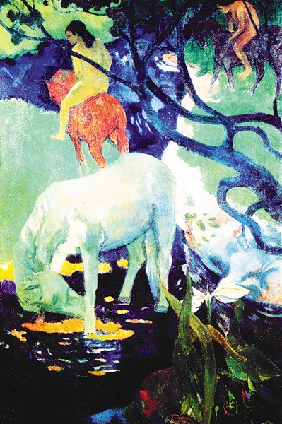 1898年左右,高更的艺术创作达到顶峰,他画出了《我们从何处来?我们是谁?我们往何处去?》这样的鸿篇巨制,也画出了包括《白马》在内的一系列歌颂人与自然的隽永之作。在《白马》中,画家的激情通过色彩得以完全释放,大片的红、绿、蓝色块交相铺陈,然而整体的调子是如此优美和谐。