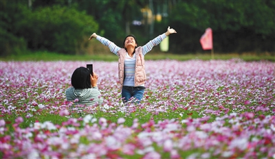 在龙寿洋花海,金灿灿的万寿菊,绚烂多姿的格桑花,还有那一树树早已绽放的热带樱花,在这里汇成一片花的海洋!西藏的格桑花、武汉的樱花,如今全都汇聚在这里,共同演绎美丽的大地艺术。