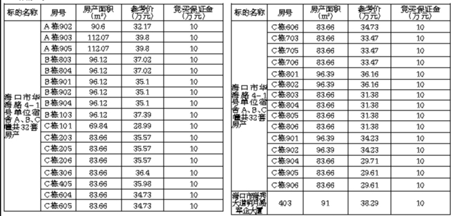位于海口市华海路东海小区第3幢共16套房产,总面积1444.8平方米,参考价560万元/整体,竞买保证金100万元。