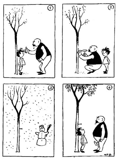 相比之下,我更喜欢那本叫做《父与子》的漫画书,每幅画,都能感受到那种自然而然的父子连心的喜悦。我期待着,有一天,你也会陪儿子读到这部伟大的作品,有一天,你和儿子在一起时,也能洋溢着那种自然而然的父子连心的喜悦!到那时,当我说起“谢谢你,他爸!”该是多么会心多么甜蜜!