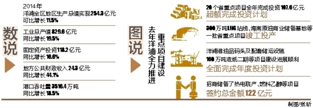 洋浦工委副书记、管委会主任张磊在代表管委会作工作报告时说,2014年,宏观经济下行压力剧增,洋浦开发区内油气化工、浆纸等主导产业产品价格持续下跌,情况对洋浦十分不利。在这种情况下,洋浦积极适应新常态,通过改善投资环境、推进重点项目建设等举措实现了经济的逆势增长。