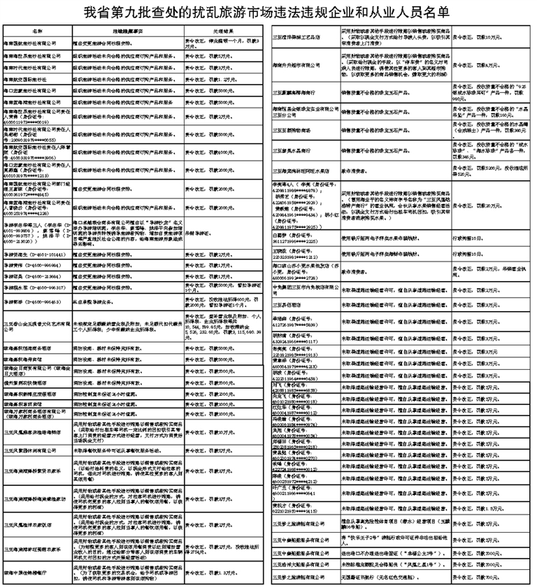 这次公布的涉旅案件共有63宗,涉及旅游企业52家(次),涉及个人21人(次)。其中涉及旅行社6家,旅行社责任人6人,导游8人;旅游酒店类7家;旅游景区类1家;旅游购物企业7家(次),经营旅游购物个人7人;旅游餐饮类7家(次);旅游交通类19宗;涉海旅游企业类5家。此次公布查处的涉旅案件中,依法责令旅行社停业整顿1家,依法吊销导游证3人;行政拘留2人,罚没款461万元;补缴税款1054万元。