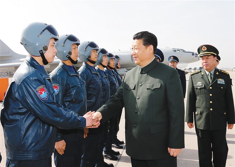 在飞行准备室,习近平观看了空军航空兵某师部队建设汇报短片,观摩了导弹模拟训练演示。随后,他来到机场停机坪,认真察看各型战机和机载武器,实地考察部队练兵备战成果。某新型轰炸机前,飞行机组和机务人员整齐列队,习近平走上前去,同大家一一握手,详细询问学习、工作和训练情况。他登上战机,坐进驾驶舱,了解装备性能,体验操作使用。习近平勉励大家按照“地面苦练、空中精飞”的要求摔打磨砺自己,以极端负责的精神精心维护保障战机,不断提高技战术水平,做到一旦有事就能闻令而动、克敌制胜。