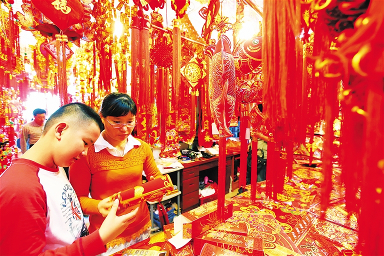 上午9时许,海口东门市场。虾仁干、粉丝、腐竹……来自黑龙江大庆的候鸟老人刘清兰和老伴一边沿着摊位往前逛,一边对比着手里的购物清单。“早在一个星期前我们就开始准备年货了,今天主要是做些补充。”刘清兰喜滋滋地告诉记者,她已经备齐了糖果、水果、瓜子等各种小吃,昨天听说海口人大年初一要吃斋菜煲,所以今天过来补充点食材。说着说着,刘清兰在一家卖海南年糕和八宝饭的摊位前问起了价格。“八宝饭才15元,不贵,给我来两份,还有那个红糖年糕和白糖年糕也各给我来半斤。”刘清兰说,在海南过年就是要来点海南味。