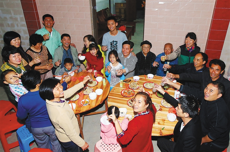 “快啦快啦,等侄子一家回来,团圆饭就上桌啦!”天色渐暗,此起彼伏的鞭炮声,让文昌市翁田镇内六村村民何敦旭的这句话,说得只有他自己能听见。但对这个四世同堂的家庭来说,能在新家里吃上这顿团圆饭,是十分值得期待的。