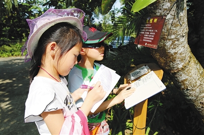 2月17日,在万宁兴隆热带花园,两位小游客在无忧树下认真地做着记录,在游玩过程中学习知识。