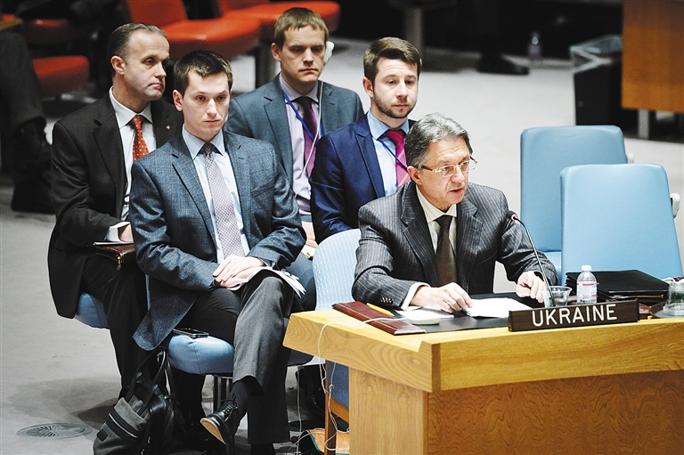 2月17日,在纽约联合国总部,乌克兰常驻联合国代表谢尔盖耶夫(右)在安理会上就乌克兰局势举行的会议上发言。 联合国安理会当日一致通过决议,敦促乌克兰东部各方执行12日达成的“履行明斯克协议的综合措施”,实现全面停火。 新华社记者 牛晓雷 摄