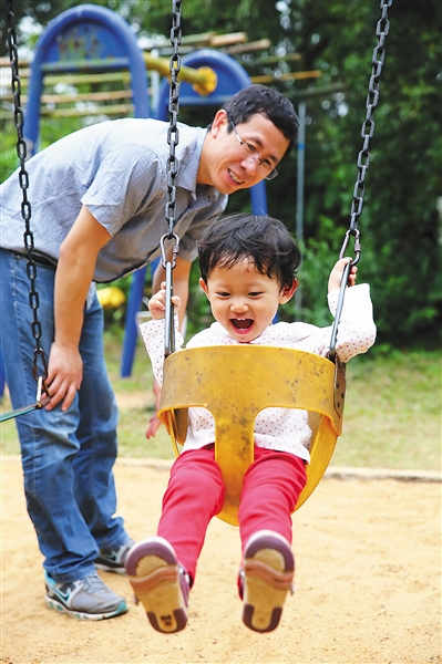 2月22日,游客在海口开心农场体验一起荡秋千的乐趣。本报记者 张茂 摄
