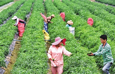 “西江村每天至少有1万斤泡椒销往内地市场,就怕没时间摘椒,不怕卖不出去。”新江村委会党支部书记李海发说。据悉,从春节至今,每天都有两辆大货车到村里收购泡椒,销往广东、北京等地。