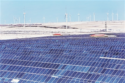 图为河北张家口坝上地区的一处光伏发电厂与其后的风电场(1月19日摄)。