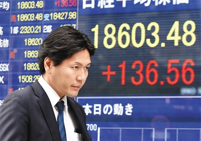 2月24日,一名男子走过日本东京街头一处股价显示牌。 东京证券交易所日经股指当日以18603.46点收盘,比上个交易日上涨136.56点,创近15年来新高。 新华社/法新