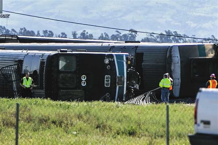 2月24日,在美国加利福尼亚州奥克斯纳德市,救援人员站在事故车辆旁。 美国加州南部奥克斯纳德市附近24日晨发生一列轻轨列车与停在轨道上的一辆货车相撞事故,造成至少30人受伤。
