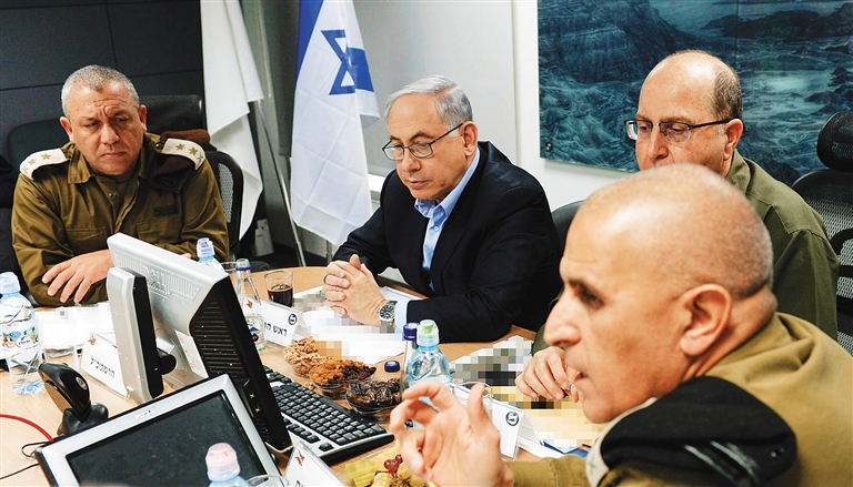 2月24日,在加沙地带附近的以色列国防军南方司令部,以色列总理内塔尼亚胡(左二)、国防部长亚阿隆(右二)出席会议。 以色列总理内塔尼亚胡当天再次重申反对伊核问题六国(英国、法国、俄罗斯、美国、中国和德国)与伊朗可能达成的协议,他将尽一切可能阻止伊核问题协议的达成。 新华社/基尼图片社