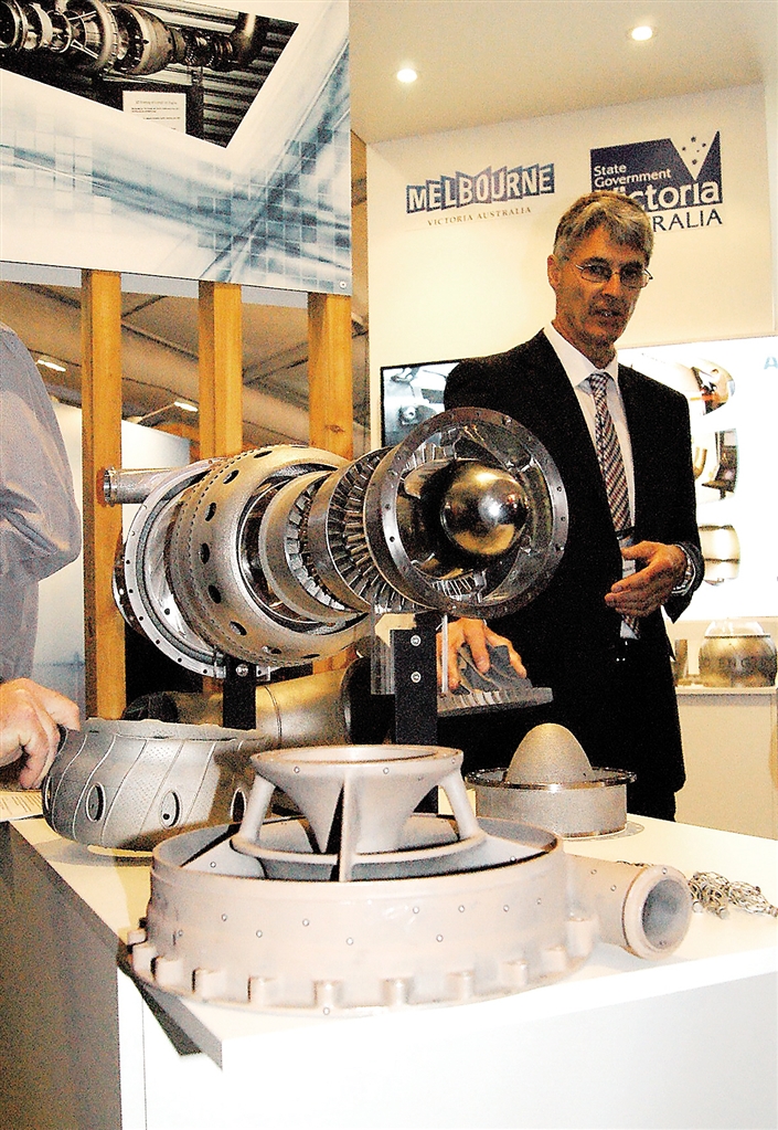 2月26日,一名男子在墨尔本举行的澳大利亚国际航空展上观看展出的3D打印飞机引擎。 当天,澳大利亚研究人员在澳大利亚国际航空展上展示了世界上首次运用3D打印技术制造的飞机引擎。这项制造业的突破将促使飞机引擎更廉价、轻便、节能。研究人员计划在未来一年内对3D打印的引擎零件进行飞行测试,并在两到三年内将其应用于商业领域。 新华社/路透