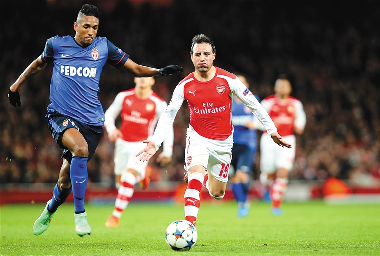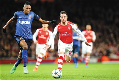 北京时间2月26日,在欧冠八分之一决赛首回合最后两场较量中,阿森纳主场1:3爆冷不敌法国的摩纳哥,勒沃库森力挫西甲卫冕冠军马德里竞技。图为阿森纳队球员卡索拉(右)与摩纳哥队球员华莱士争抢。新华社发