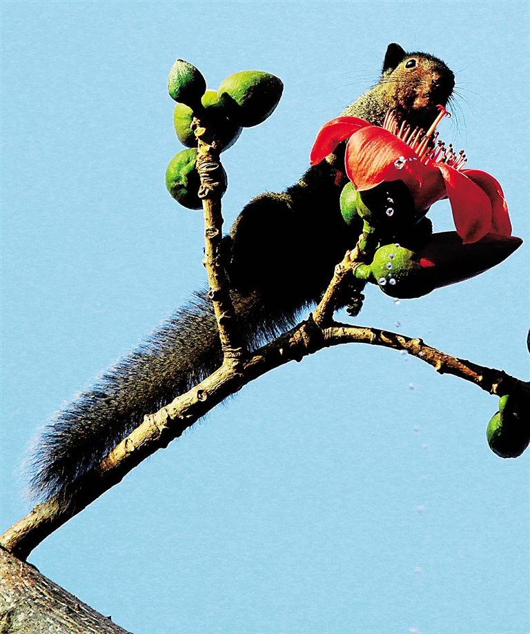 左右图分别为,2月26日小松鼠、鸟儿在盛开的木棉花枝头争享“花蜜大餐”。