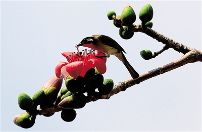 近日,三亚南山景区内外木棉树的花朵在枝头次第绽放,格外鲜艳,大片的木棉花远远望去,就像燃烧的火焰,格外美丽,吸引了鸟儿和松鼠前来享受“花蜜大餐”,成为一道游人争相拍照的美景。