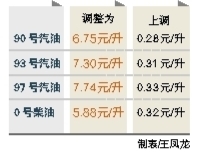 经测算,90号汽油上调0.28元/升,93号汽油上调0.31元/升,97号汽油上调0.33元/升,0号柴油上调0.32元/升。