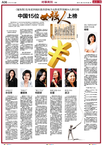 《福布斯》杂志26日发布亚洲地区最具影响力女性商界领袖50人排行榜,中国有多达15人上榜。尤为引人关注的是,电商巨头阿里巴巴首席财务官武卫和这一集团联合创始人彭蕾携手出现在榜单中,开《福布斯》“一家企业两名女高管同时上榜”之先例。 15人来自中国大陆、