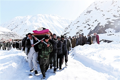 2月26日,在阿富汗东部潘杰希尔省,人们抬着雪崩遇难者遗体参加葬礼。 阿富汗官员27日说,连日来发生在阿富汗各地的暴雪和雪崩已造成至少216人死亡,27人受伤。该国大量房屋依山而建,容易受到雪崩、泥石流等自然灾害的影响。 新华社/法新