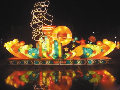 华灯初上,各坊的灯车从不同方位出发,一辆辆以“海南腾飞”、“文化下乡”、“奔向小康”等为主题的灯车,开了过来,向镇中心广场汇聚。顿时,锣鼓喧天,灯浪涌动,人声鼎沸。这时,我早已不是毛头小伙,但是,观灯的那一份热情仍然有增无减。我老早就守候在灯车必经的路口。观灯的人群来自方圆十里,身旁的老人,小孩,跟我一样,异常兴奋。游灯一年一度,游灯所营造的更是祥和、喜庆的气氛。