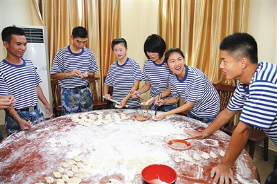 临近中午,海军西沙某水警区食堂里的大圆桌上摆满了面团、饺子皮和饺子馅,肖杰和众多官兵、军嫂们忙着擀皮包饺子。