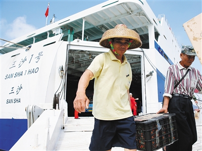 春节前夕,三沙市交通补给船“三沙一号”靠泊三沙市永兴岛码头,给三沙各岛礁居民运送了一批包含有生活、生产物资的春节慰问品。这是在羊年春节来临前三沙市给各岛礁居民运送的最后一趟补给物资。本报记者 宋国强 摄