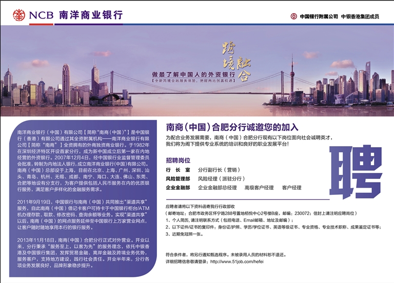 为配合业务发展需要,南商(中国)海口分行现有以下岗位面向社会诚聘英才,我们将为阁下提供专业系统的培训和良好的职业发展平台!