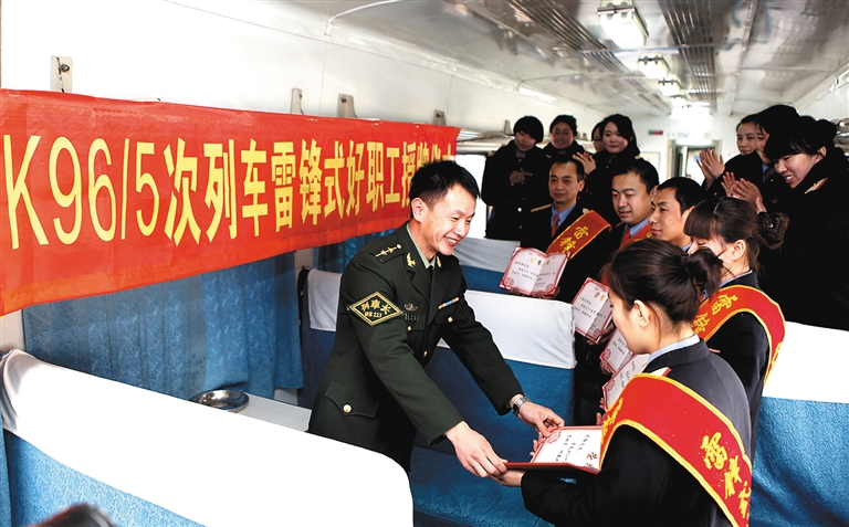 3月2日,解放军驻抚顺某部“雷锋连”连长薛步瑞为沈铁锦州客运段北京车队K96次雷锋号列车的“雷锋式”职工颁发证书。锦州客运段北京车队K96/5次雷锋号列车职工在数十年的精神文明、军企共建、学习雷锋好榜样、争当雷锋式好职工活动中,先后涌现出17名先进生产者、优秀列车员,雷锋精神薪火传承。 新华社发(高锦旭摄)