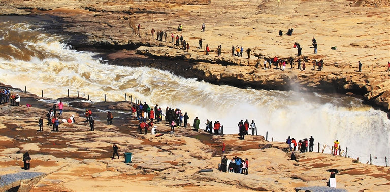3月3日,游人在壶口瀑布景区游览。 随着气温的逐渐升高,陕晋交界的壶口瀑布冰雪逐渐消融。入春以来,壶口瀑布景区每天的游人均在千人以上,迎来旅游旺季。新华社发