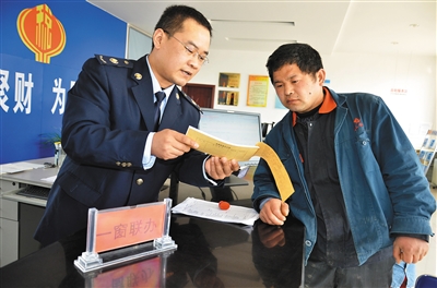 3月2日,在山东省茌平县乐平铺镇联合办税厅“一窗联办”窗口,一名工作人员在为群众办理领票和报税业务。 山东省茌平县基层税务部门全力打通服务群众“最后一公里”,从今年2月份开始,在该县乐平铺镇试点国税地税“一窗联办”业务,实现两家业务一窗即时切换办理,简化了纳税人的办税环节。 新华社发